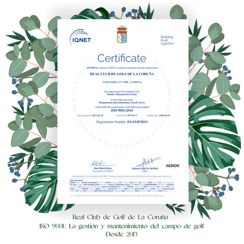 El Real Club de Golf de La Coruña ha superado con éxito la auditoría de seguimiento de su sistema de gestión de calidad, certificación que cumple con la norma internacional ISO 9001, en el ámbito de la gestión y mantenimiento del campo de golf. Este logro confirma que, desde 2013, el Club mantiene de forma constante los más altos estándares de calidad, demostrando su firme compromiso con la excelencia y la mejora continua al servicio de sus Socios.