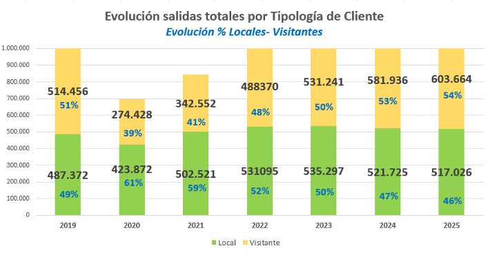 Segmentando los datos por tipología de clientes, se observa que las salidas de jugadores visitantes han experimentado un incremento de más de 21.500 GFs adicionales este año y representan ya un 54% del total de salidas del destino superando las 603.500 rondas, mientras que las de jugadores locales (socios y abonados) tienen una tendencia regresiva.