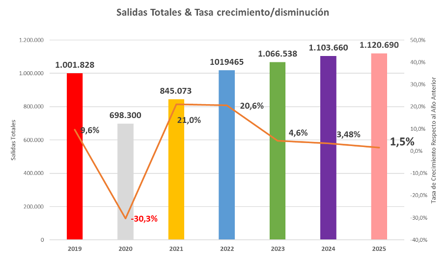 Como se aprecia en el gráfico, las salidas globales han superado por 4º año consecutivo el millón de rondas, incrementándose sin parar desde el 2020 y superando ampliamente las de 2019 (año pre covid) lo que consolida el crecimiento y tendencia alcista del destino.